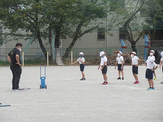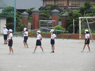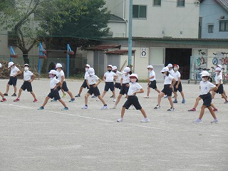 3年2組が運動場で体育を行っていました。友達との距離をあけ、整理運動をしていました。今日は、涼しい風が吹いていて、ここちよいです。