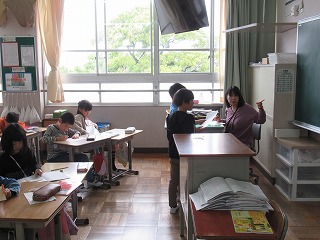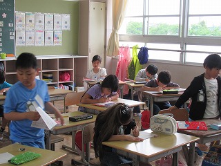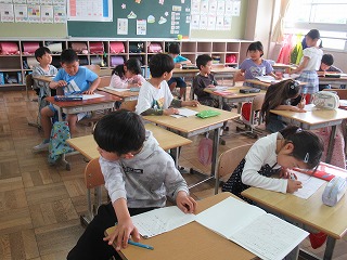 2年1組は国語の時間でした。国語のプリントに自分の考えを記入していました。書けた児童から、先生に確認してもらっていました。