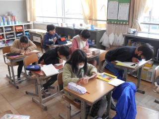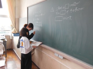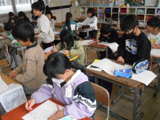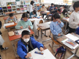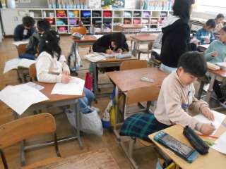 絵の中から二等辺三角形を探し、色を塗っていました。
