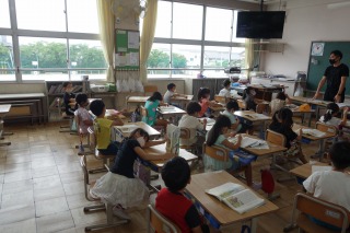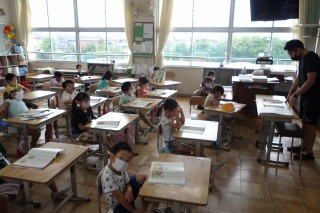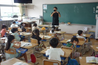 1年1組の国語は、「おむすび ころりん」の学習でした。「たとえ」についての説明を聞きました。