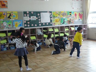 音楽に合わせて、こねこになったつもりで一人一人が思うような表現をしました。