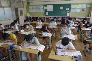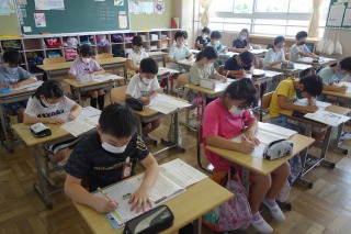 4年1組の書写は、硬筆の学習でした。書くときの姿勢や、えん筆のにぎり方を意識して書きました。