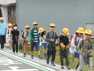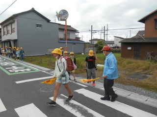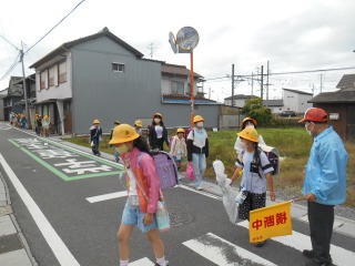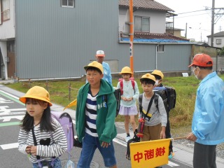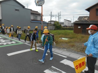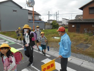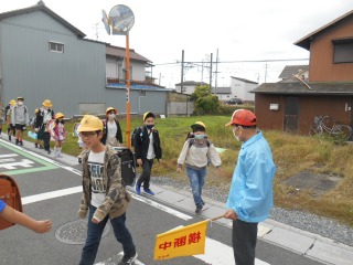 曇り空で、少し肌寒い日です。見守り隊や保護者の方に見守られながら、安全に1列で登校してきました。