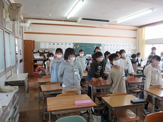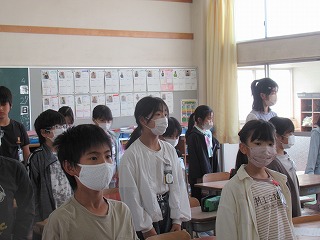 4年1組では、号令がかけられ、姿勢よく起立をしていました。