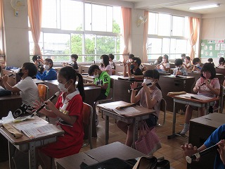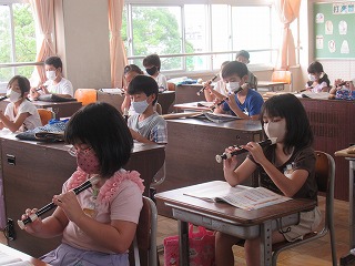 3年1組では、音楽の時間、リコーダーの練習を行っていました。指使いの確認です。