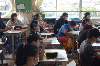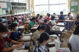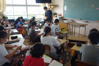 5年2組は、授業のはじめの時間帯に、外国語の小テストの答え合わせを行いました。黒板で正確なつづりを確認しました。