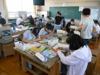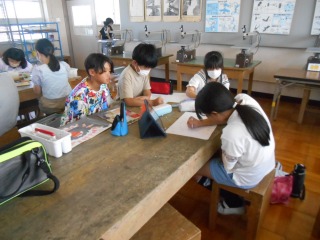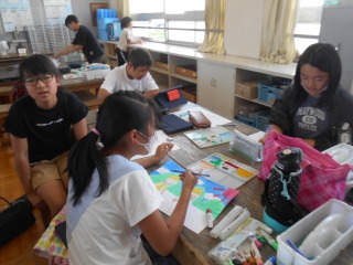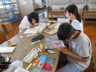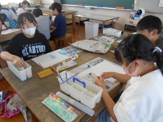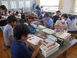 野外活動の思い出を、絵の具を使って描いていました。ウォークラリーを描いている子が多かったです。