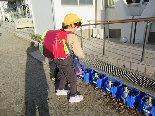 1年生が育てているチューリップの鉢植えに水をやっていました。春にはきれいな花をさかせてくれますね。