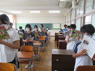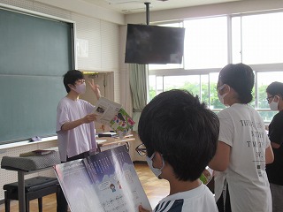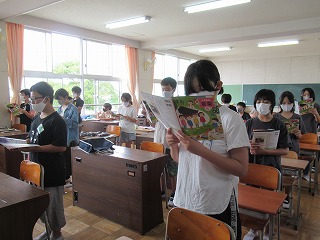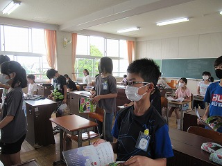 6年1組が音楽室で音楽の授業を行っていました。半分ずつ、歌を歌い、確認していきます。工夫をしながら、授業が進められていました。