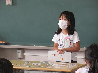 1年1組では、スピーチを行っていました。一人ずつ前に出て発表します。その後、質問を受けていました。