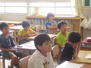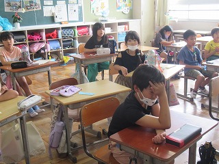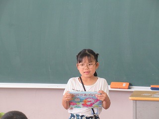 2年2組では、前に出て発表をしていました。他の子は、その発表をきいていました。