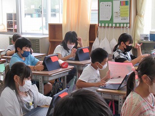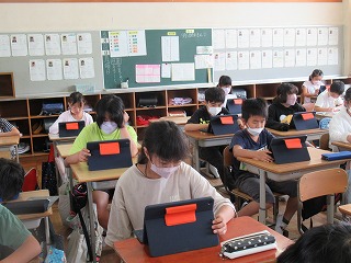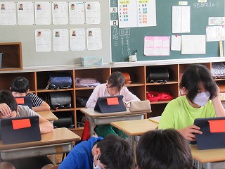 4年2組では、社会科の時間、タブレットを使い、調べ学習をしていました。