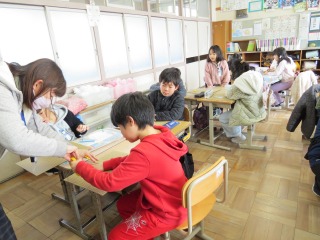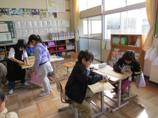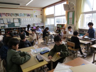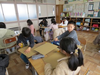 下書きに沿って、薄い段ボールを切る作業をしていました。上手に切れたかな?