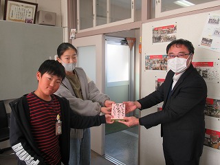 美和小のみんなが募金してくれた赤い羽根募金を、児童会役会長と環境委員長が代表して、社会福祉協議会の方に渡してくれました。