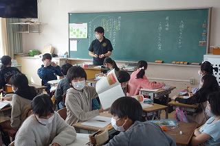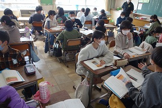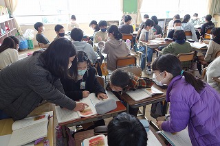 5年1組の国語は、「大造じいさんとガン」の学習でした。班で協力して、第2場面の読み取りを行いました。
