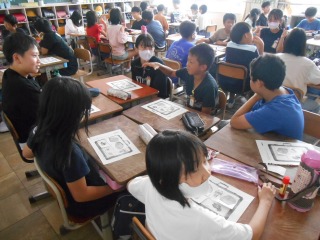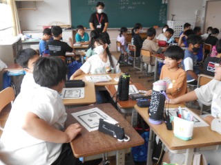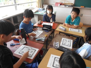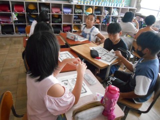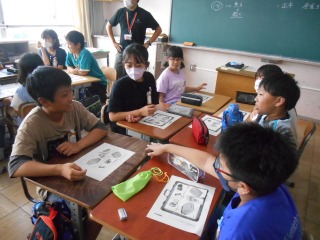 カードを使って、避難時に持っていくものを班で相談しながら考えていました。