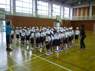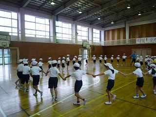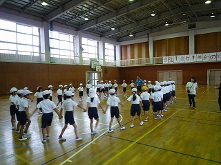 先生の号令に合わせて、列を変形したり、輪をつくって動いたりしました。