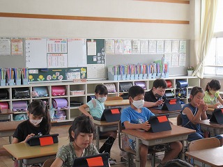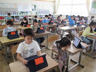 3年1組が、タブレットを使い、朝学習を行っていました。