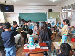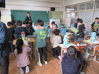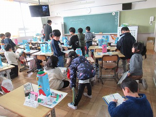 2年1組では、図画工作の時間、友達の作品を見て、鑑賞を行っていました。