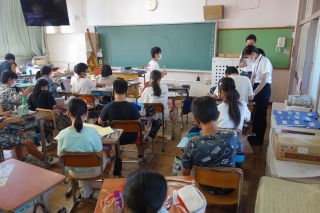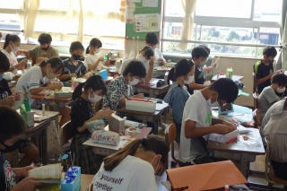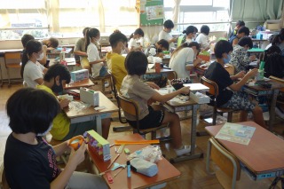 6年2組の図工は、「くるくるクランク」の制作でした。クランクの動きも確認しながら、装飾作業を進めました。