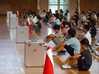 選挙管理委員の皆さんが中心となり、4~6年生が体育館に集まり後期児童会役員選挙を行いました。立候補者の演説を聞き、投票用紙に真剣に記入していました。