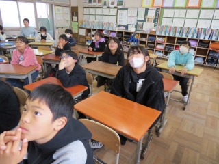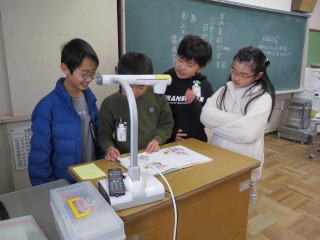会社活動の一つとして読書会社の児童が本を選び、読み聞かせをしていました。読み手はモニターに絵を映しながら伝わりやすい読み方を心掛け、聞き手は一生懸命に内容に一生懸命に耳を傾けていました。