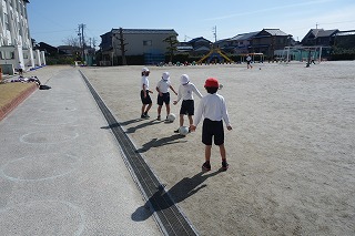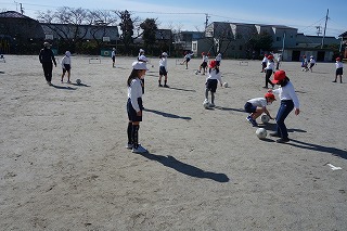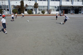 2年1組の体育は、2組と合同でサッカーのパス練習をしました。