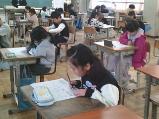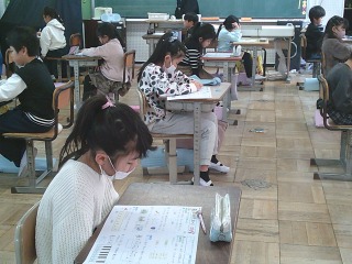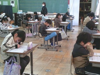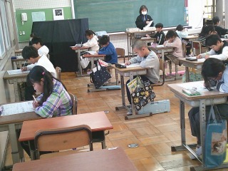 テストを行っていました。CDから流れる問題を集中して聞きながら、答えていました。