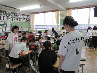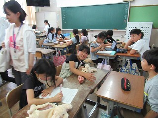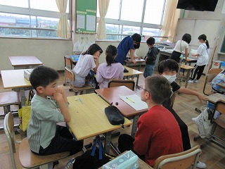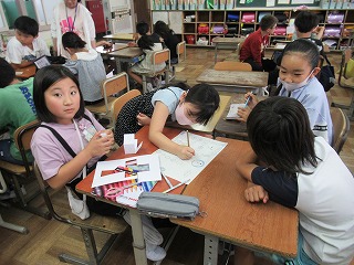 4年2組はグループになって、すごろく作りを行っていました。みんなで意見を出し合いながら、活動していました。