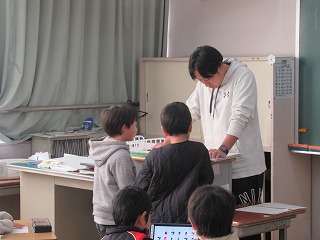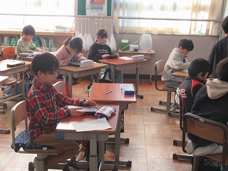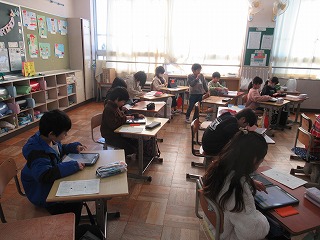 2年2組は国語の時間でした。文章を作ってプリントに記入し、先生に確認してもらっていました。終わった子からタブレット学習に取り組んでいました。