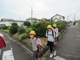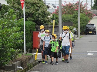 今日も見守り隊の皆さんに付きそわれ、安全に登校できました。むし暑い中、ありがとうございます。子どもたちも夏休みの課題を手に登校してきました。