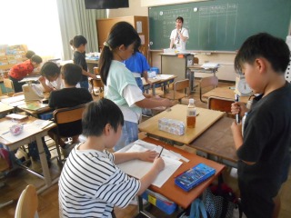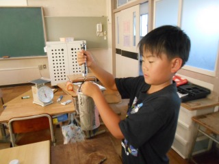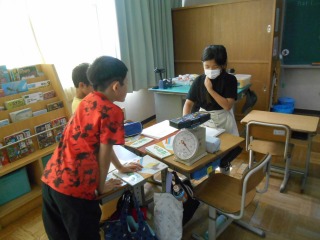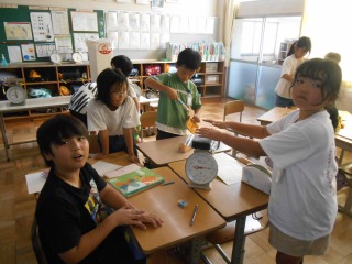 いろんなはかりを使って、身の回りの物の重さを測っていました。何をどのはかりで測るといいか考えながら、はかりを選んでいました。