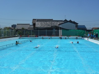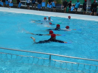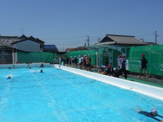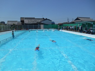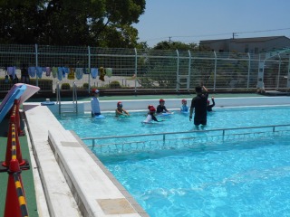 ビート版を使って、バタ足をしっかりと練習していました。浅いプールでは、水に慣れる練習をしていました。