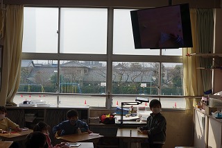 1年1組の学級活動は、折り紙の折り方を、モニター画面を使ってお互いに教え合いました。