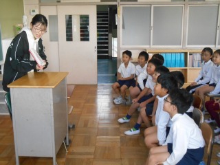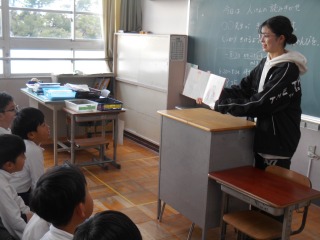 4年2組の先生が読み聞かせをしていました。絵本を読み終わった後、場面を振り返っているところでした。