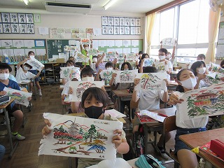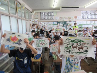 修学旅行で制作した友禅染の作品が、届きました。修学旅行の思い出が、よみがえってきます。教室で、写真をパチリ。ご家庭でじっくり作品を味わってください。