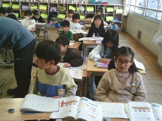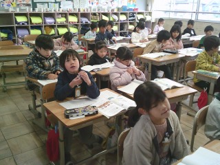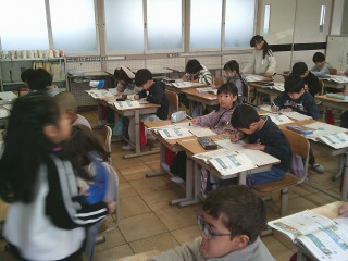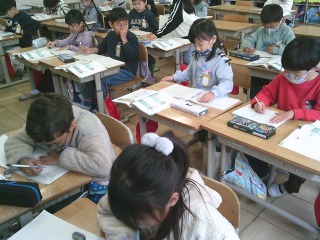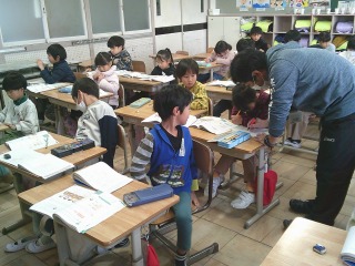 2けたひく1けたの計算をしていました。先生が一人ずつ回ったり、終わった子からノートを持って行ったりし、確認をしているところでした。