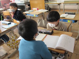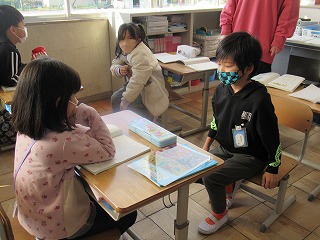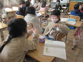 1年1組では、国語の時間、前・後ろの友達同士で、話し合いをしていました。
