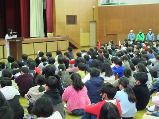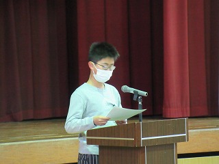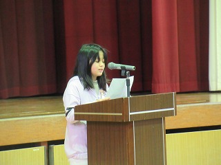 12月に行われた赤十字の研修会で得たことを、全校の前で発表してもらいました。学校のリーダーとして、しっかりとした自分の意見をもち、意見発表ができました。すばらしい発表に、きっと次の子たちへのバトンがつながれたことと思います。
