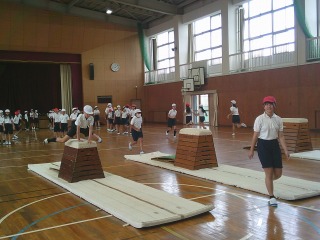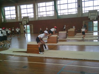体育館で跳び箱に取り組んでいました。それぞれ段数が違う跳び箱が用意され、自分の力に合わせ飛びながら、次の高さにチャレンジしていきました。