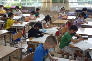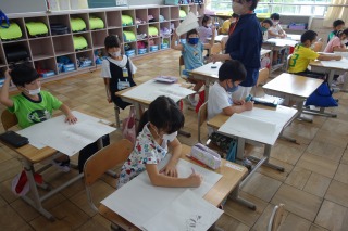 1年2組の図工は、『のってみたいな いきたいな』の絵を描きました。自分を大きく描くことに気をつけて描きました。