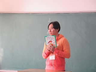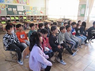 1年2組の子どもたちが、2年1組の担任の先生に読み聞かせをしてもらいました。