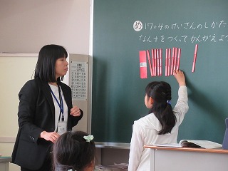 2年1組は算数の時間でした。17+4のくり上がりのある計算をどのように考えればいいのか、黒板の具体物を使って説明していました。