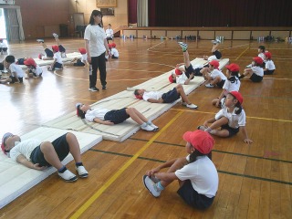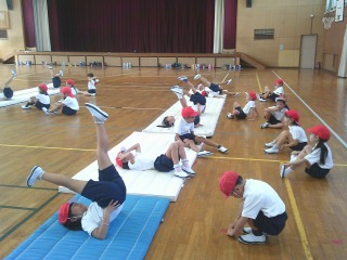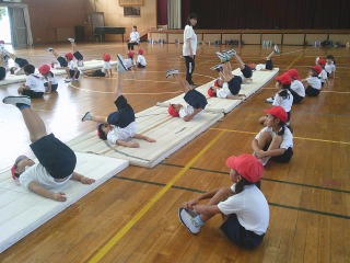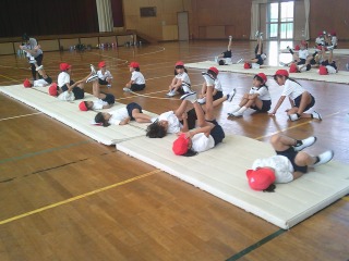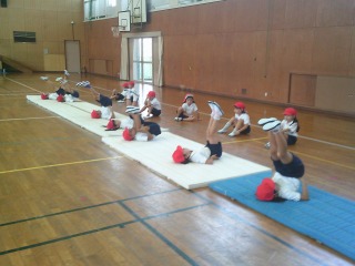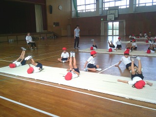 マット運動に取り組んでいました。寝ころんだ状態から、両足を上げてグーチョキパーのじゃんけんをしました。