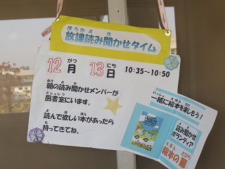 12月は、13日の水曜日に2時間目の休み時間、読み聞かせが行われます。楽しみにしていてくださいね。ボランティアの皆さんが、忙しい中、皆さんのために読み聞かせをしてくださいます。感謝の気持ちを忘れずに・・・。