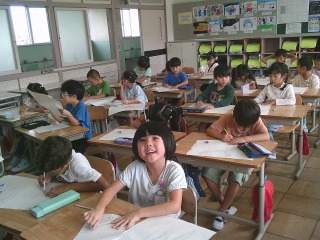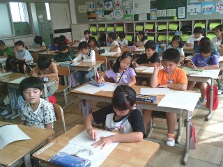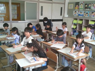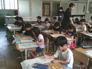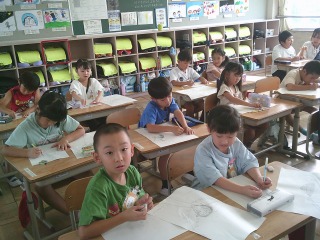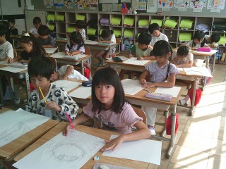 大きな紙に、鳥の巣を描いていました。卵がひなにかえり、寂しい思いをしないように何を巣に入れるか考えて描いていました。