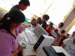 図書委員は大忙し。本のラベルに付いているバーコードをコンピュータで読み取り、貸し出しの手続きをしていきます。