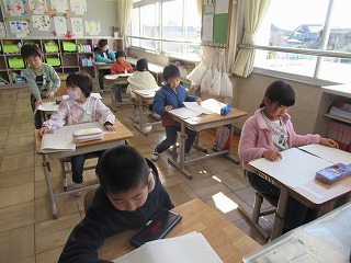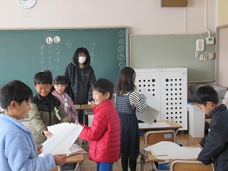 1年1組では、朝学習の時間、作文のプリントを集めていました。