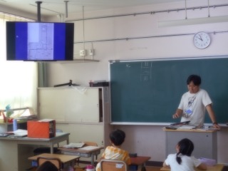 町探検の説明を聞いていました。地図をモニタで見ながら、行き先の確認をしていました。