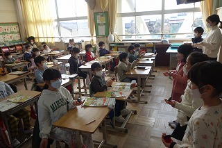 2年1組の音楽は、子ぎつねコンコンの音楽に合わせてカスタネットを打つ練習をしました。